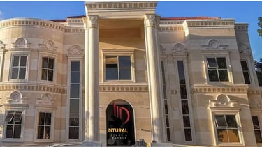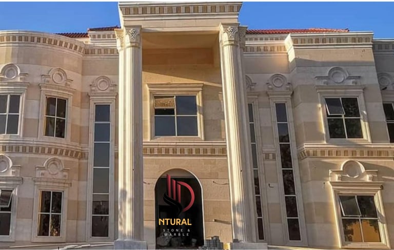 The beauty of the exterior design of this classic villa is highlighted through the use of beige Qus stone, which adds an elegant and luxurious touch. The design is characterized by curved lines and intricate architectural details, perfectly reflecting the classic style.
